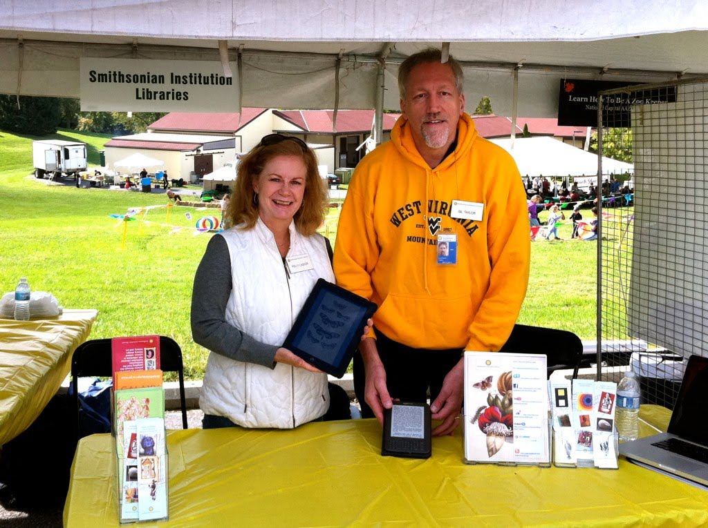 The one BHL-scanned book we pre-loaded to an iPad and brought along was big hit with the crowd, “Curiosities of Entomology” http://biodiversitylibrary.org/bibliography/8174 . It was a revelation how well the iPad works for demoing BHL in a face-to-face setting, and the book we selected seemed to work very well with the app, iBooks (Polly and Gil, pictured above, demonstrating BHL book on iPad). Young people, in particular, intuitively knew how to navigate to view the book with the device. Needless to say, we distributed many BHL cards to the nearly 150 people who visited us that weekend.