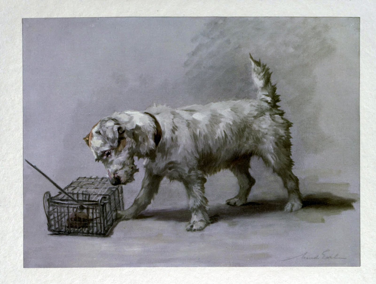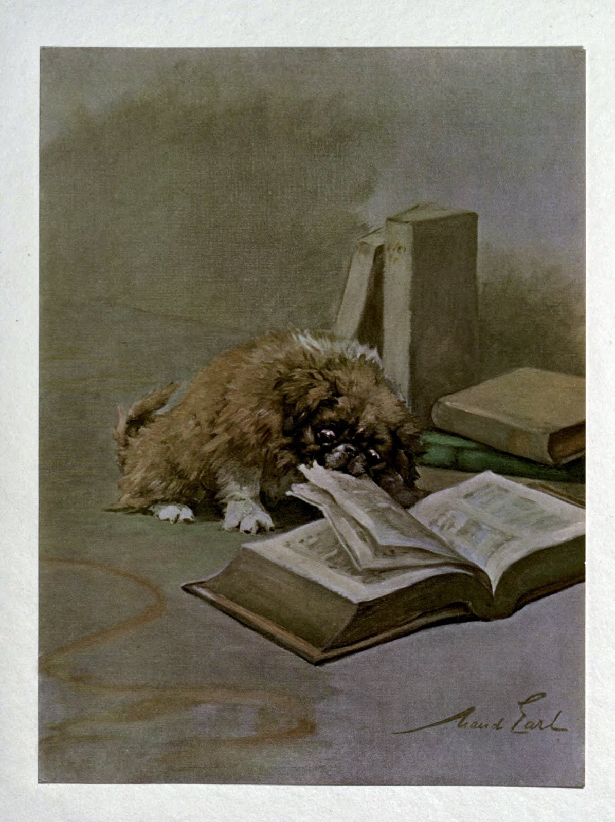 “To experience the fullest pleasure of the ownership of a dog it is necessary that he should come into our possession when young, before his intelligence is formed, and innumerable other impressions crowd his brain to the exclusion of those we wish to impart.” Such a statement outlines the first rules of having a puppy – that if you wish to own a well-behaved dog and enjoy a fruitful relationship with it, you must train it from an early age, lest he “tear up your favorite book.” If you are careful to do this, and avoid being too harsh with your puppy, Smith assures the reader that he or she will have a pet, and a companion, to cherish for years to come. Looking at this image, however, you might ask, “What is the fate of the merry mite so cleverly portrayed by Miss Earl? Youth passes, middle age comes, let him play and eat and sleep while the zest is on him, so that on the advent of maturity with all its troubles he may seek consolation in the memories of a happy puppyhood.”