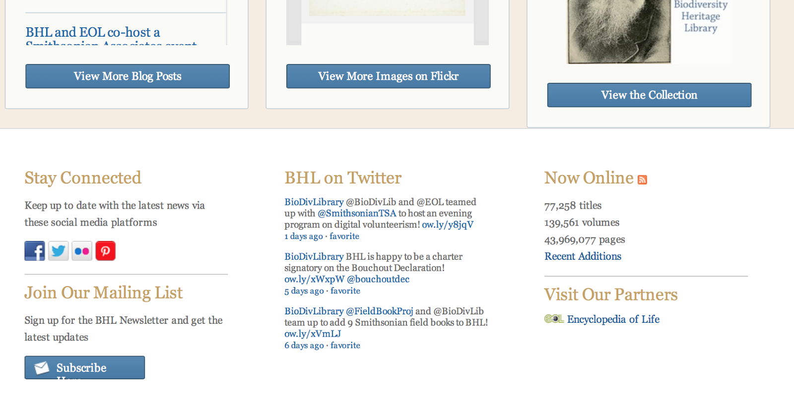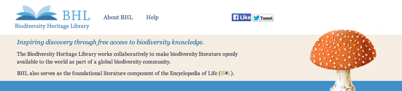 | Tell your friends that you like BHL via Twitter or Facebook by clicking the “Like” or “Tweet” buttons in the header while on the BHL homepage. |