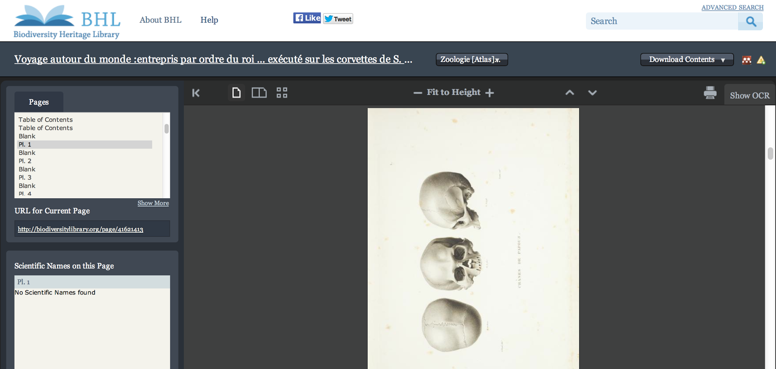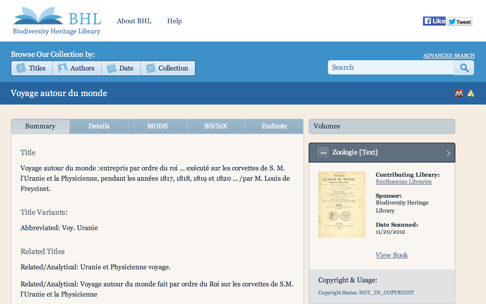 But perhaps this isn’t enough. Say you want to “like” or share a specific title, volume, or page with your friends and followers. All you have to do is find the content that you want to “Like” or “Tweet” and click on the Facebook “Like” or Twitter “Tweet” button while on that page in BHL to send a title, volume, or page specific tweet or page post.