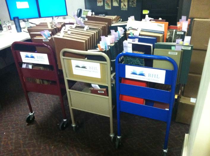 Staff members work to resolve this feedback by assigning them to various BHL institutions to address. We also have a system in place that helps to help make sure different institutions do not scan the same items. Once items have been selected for scanning, I will retrieve the items from the appropriate library branch which are located throughout the Smithsonian Natural History Museum building.