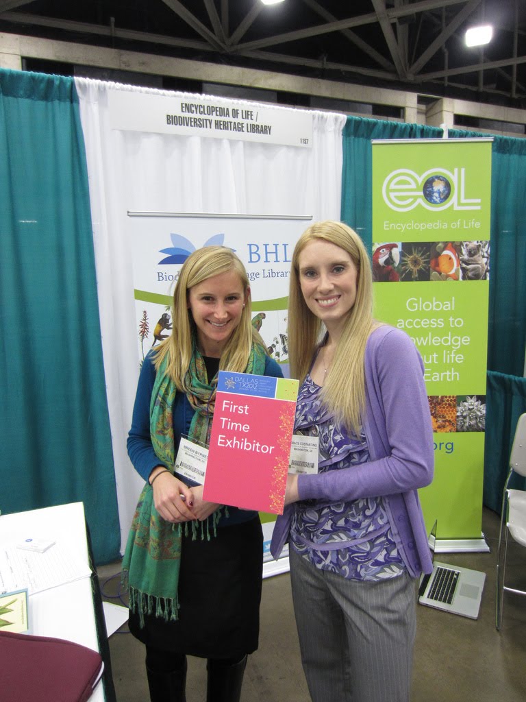 BHL, along with EOL, collaboratively hosted booth 1157 at the Midwinter meeting. EOL staff member Breen Byrnes, BHL staff members Grace Costantino, Martin Kalfatovic, Chris Freeland, and Suzanne Pilsk, as well as Smithsonian Institution Libraries (SIL) staff member Mary Augusta Thomas, operated the booth throughout the four days of exhibits (Breen and Grace pictured above at booth). We not only engaged in meaningful conversations, answered a multitude of questions about the projects, and highlighted the beautiful images in our Flickr account, but we also gave away great goodies, including brochures, pens, notepads, Post-It notes, bags, cups, and, of course, candy.