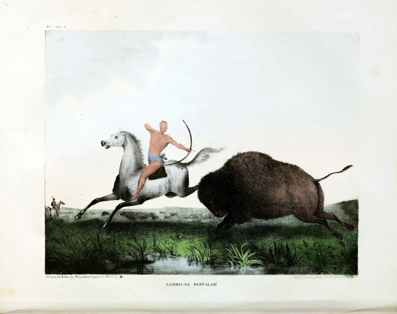 The Cabinet was a joint initiative begun by brothers Thomas and John Doughty. The three volumes of this work present the topics of natural history, sporting, travel, and general advice for the countryman, including first-hand accounts of hunting expeditions. It was issued in monthly parts from 1830-1834, and the first eight issues were particularly popular. The second volume contains a plate by Titian Ramsay Peale entitled “American Buffaloe,” depicting a Native American, mounted on horseback, hunting a buffalo, which was based on Peale’s sketches during an expedition led by Stephen H. Long to explore the Great Plains in 1819–1820. The sketches and paintings from the sketches represent the earliest first-hand depictions of the hunts.