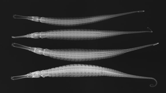 Seen here is an x-ray of an Alligator Pipefish, of the Syngnathidae family and in this case a member of the Syngnathoides genus. Accompanying the x-ray is an illustration of a variety of pipefish, including members of the Syngnathus genus and the Nerophis genus (figs. 114-118).