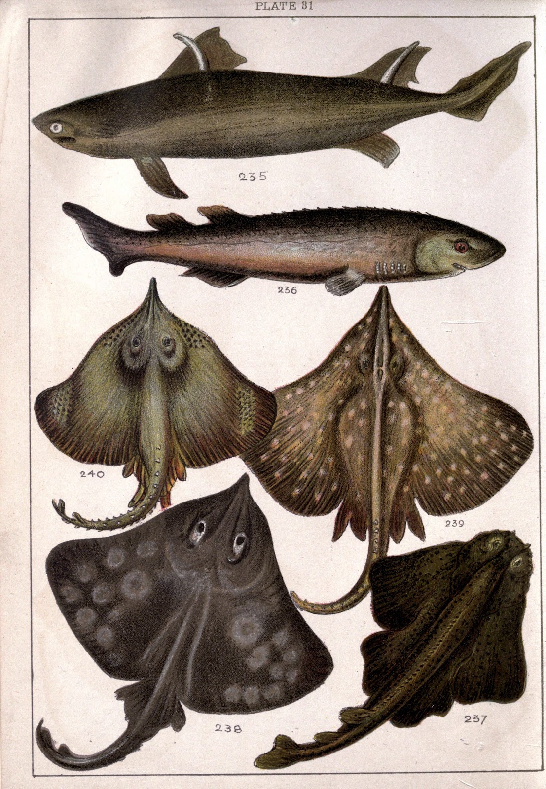 Presented here in lovely x-ray detail is the Monterey Skate, of the family Rajidae and genus Raja. This image is presented alongside illustrations of several other members of the skate family, including the flapper skate and white skate (figs. 239-240).