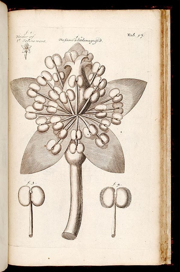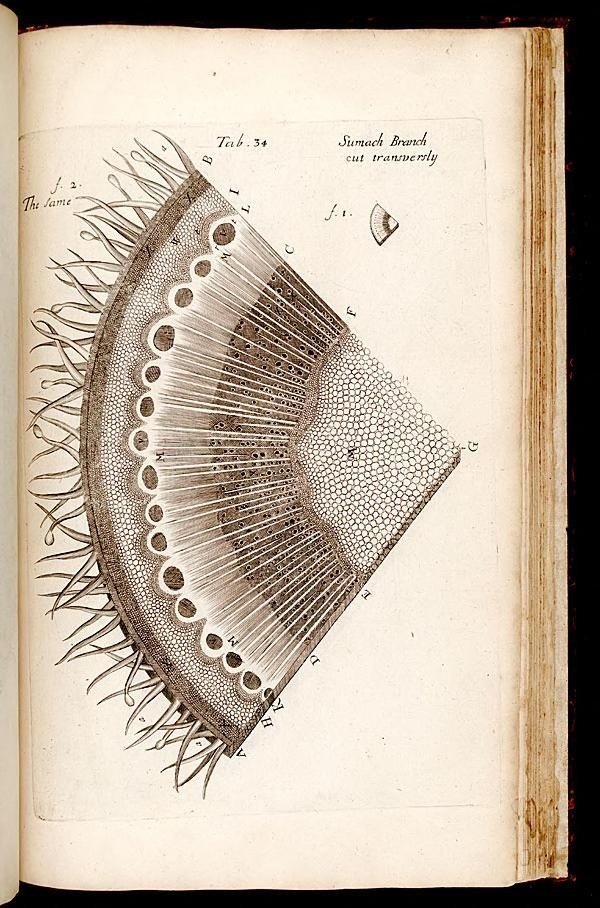 Anatomy of Plants, published in 1682, was divided into four books, entitled Anatomy of Vegetables Begun, Anatomy of Roots, Anatomy of Trunks, and Anatomy of Leaves, Flowers, Fruits and Seeds. The work was largely a collection of Grew’s previous publications, many of which were presented to the Royal Society in the 1670s. Within the work, Grew describes the key differences between the morphology of stem and root, and, as previously mentioned, details the microscopic characteristics of pollen and hypothesized that stamen are the male organs of plants.