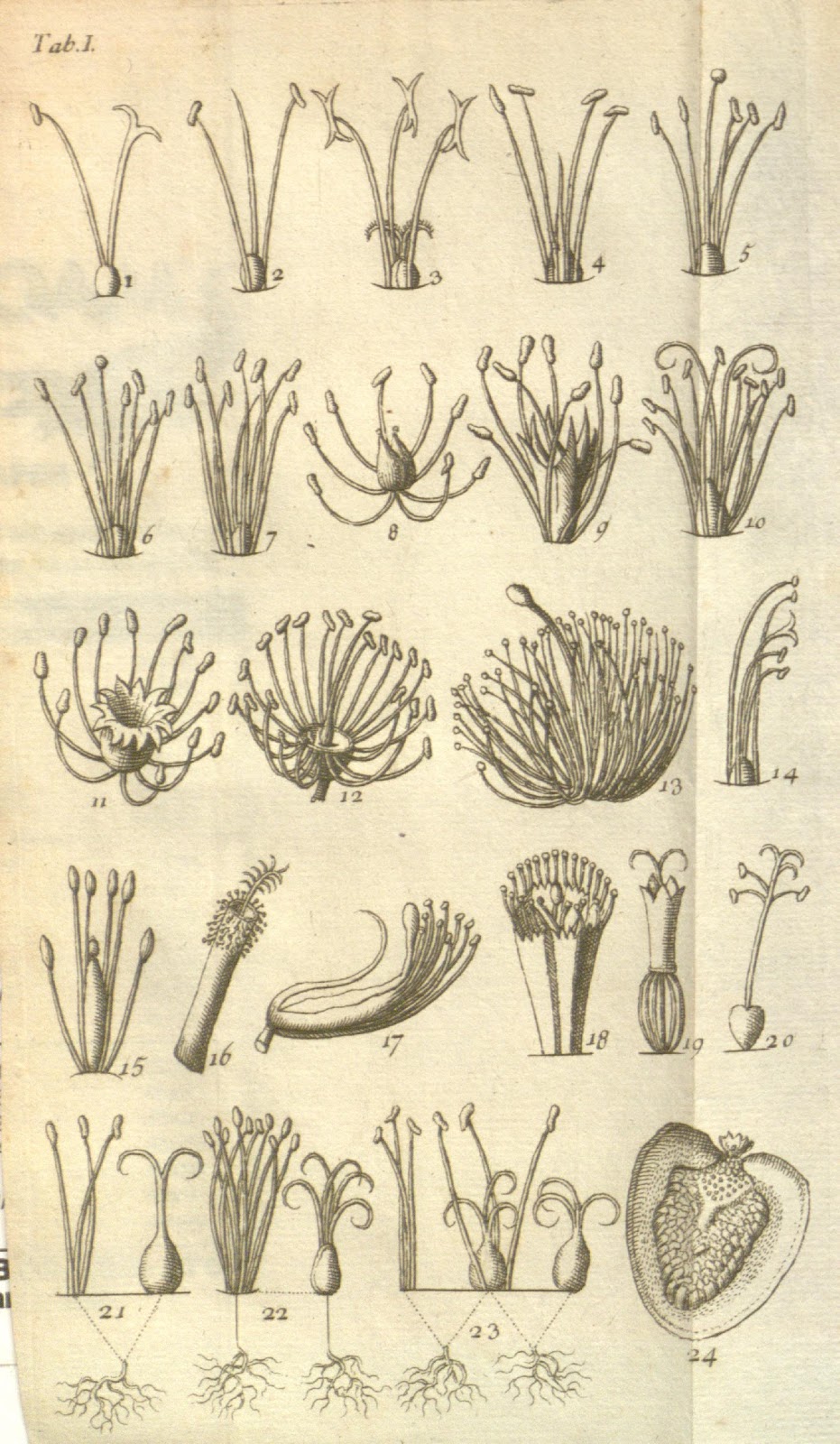 In 1728, Linnaeus enrolled at Uppsala University, where he made quick progress in the field of botany and, by only his second year, was himself giving lectures. During these years, Linnaeus began to question Tournefort’s classification system, and thus decided to develop his own. Linnaeus’ system arranged plants according to the number of stamens and pistils each possessed. This new system formed the basis of his work in the critical publication Genera Plantarum (first edition published 1737). A young German botanical draughtsman named Georg Dionys Ehret crafted a visual representation of this system, which Linnaeus included in Genera Plantarum (though without acknowledgement to Ehret). The image represents the earliest illustration of Linnaeus’ classification system for plants.