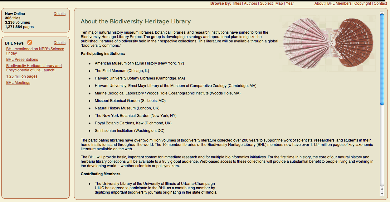 Like proud parents, we’re excited to announce that today BHL turns 5 years old! In 2007, the Biodiversity Heritage Library portal was launched with 306 titles, 3,236 volumes, and 1,271,664 pages of taxonomic literature, presented via a simple portal bathed in earthy tones. What began as a consortium of just 10 natural history and botanical libraries has today grown into a global project, with 14 US/UK consortium members as well as BHL nodes on every continent in the world except Antarctica.