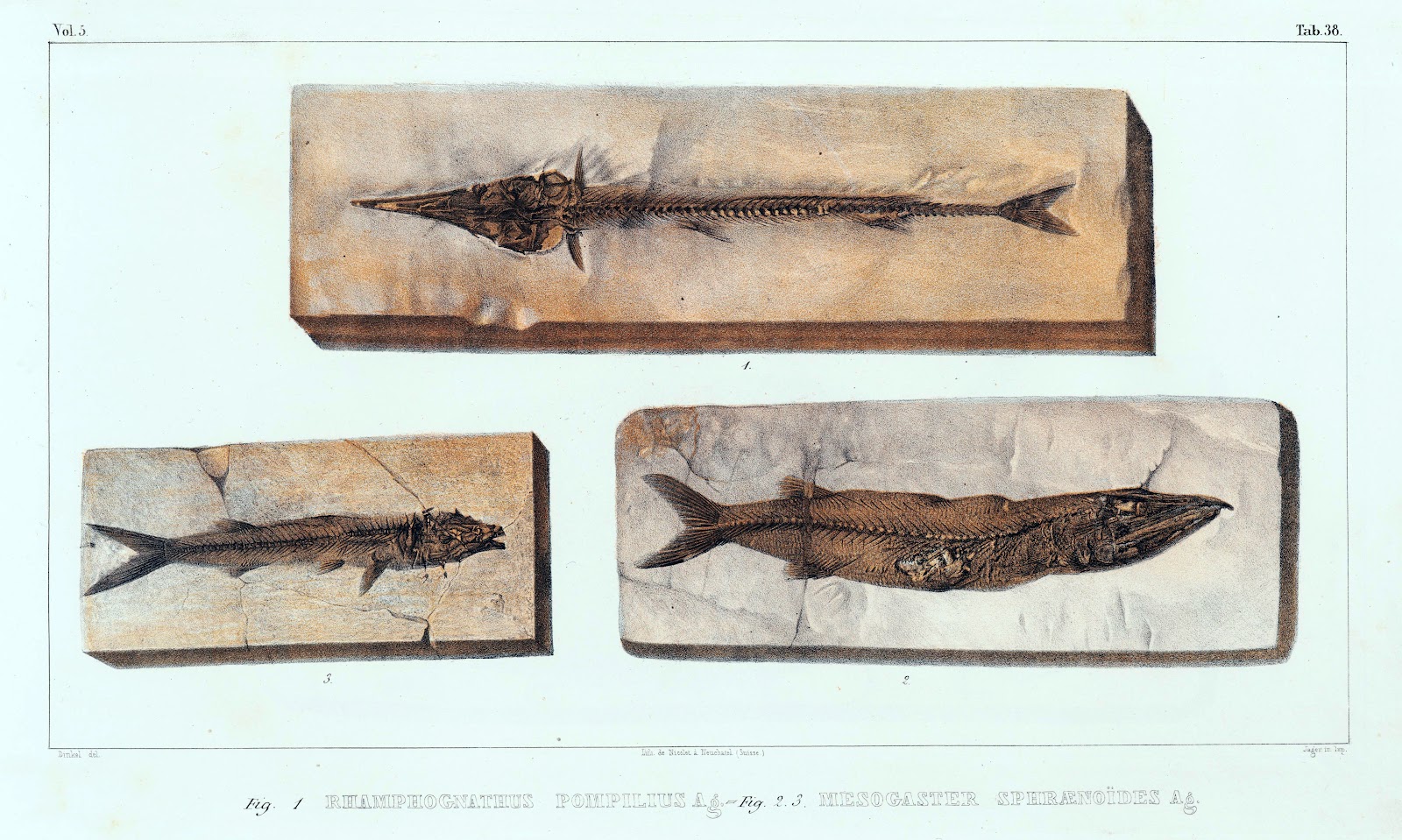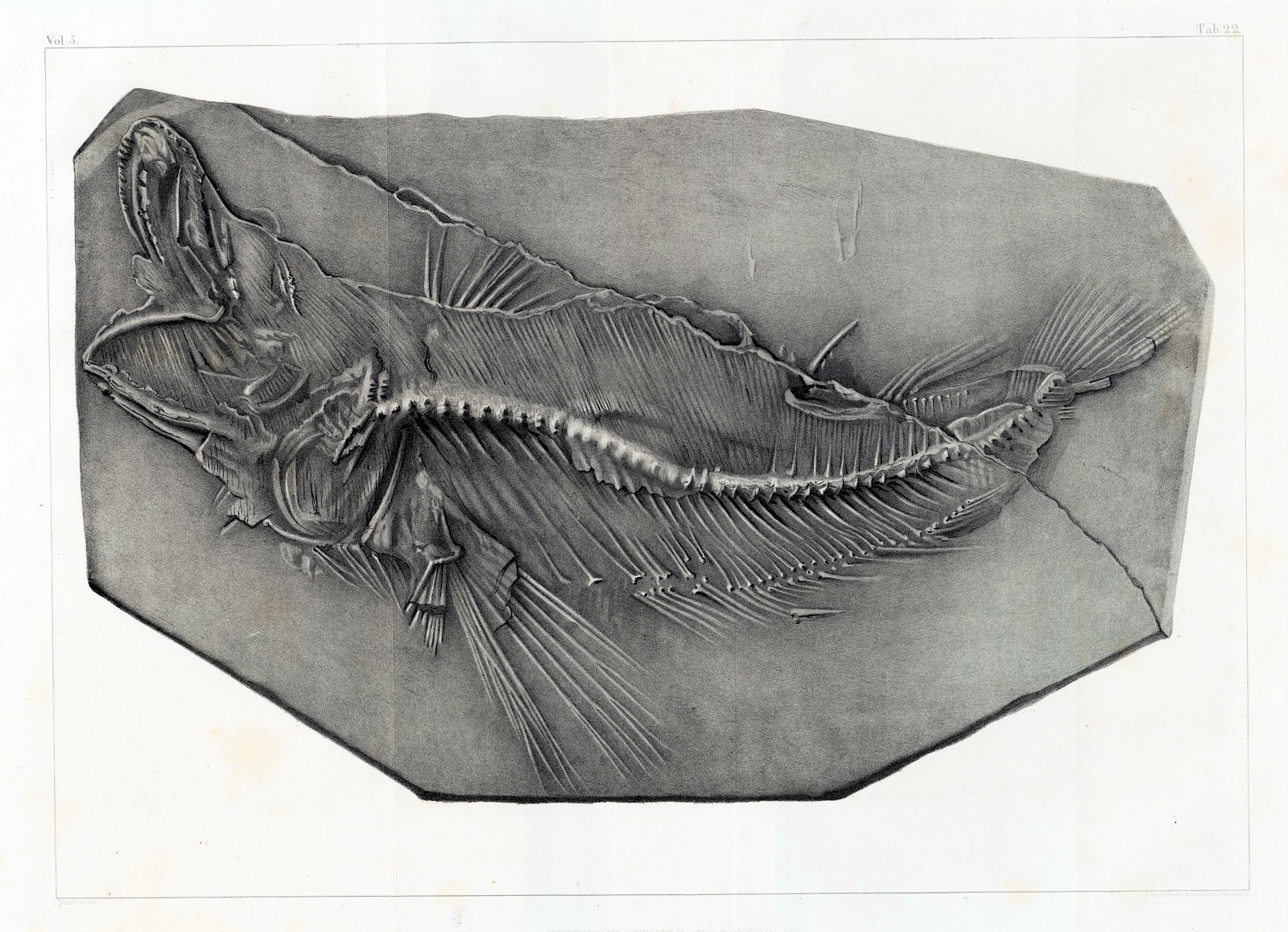 Agassiz achieved worldwide fame with the publication of Recherches sur les poissons fossiles, a five volume, gorgeously-illustrated set, published from 1833-43. The work described the fossil fish housed at the University of Neuchâtel, where Agassiz taught as a professor. The stones containing the fossils came from the slates of Glarus and the limestones of Monte Bolca.