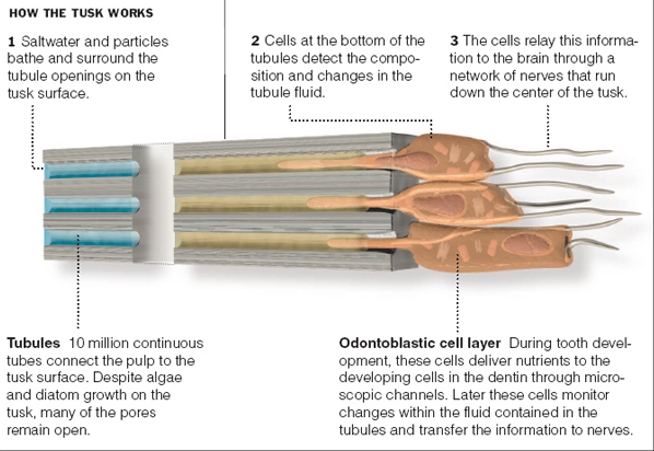 “Dental experts put the tusk under an electron microscope and found new subtleties of dental anatomy…” making a “startling discovery: the tusk, it turns out, forms a sensory organ of exceptional size and sensitivity, making the living appendage one of the planet’s most remarkable, and one that in some ways outdoes its own mythology.”–Broad, 2005, New York Times