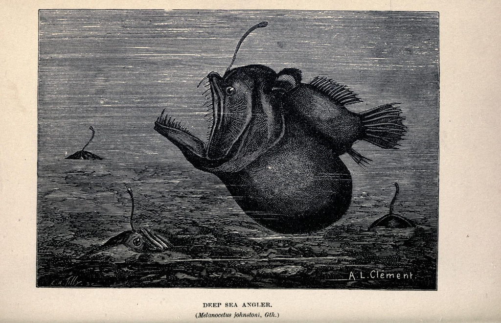 Living Lights portrays 27 instances of bioluminescence, illustrated via black and white drawings which are surprisingly effective at conjuring the illusion of light amidst the darkness. For example, Holder’s illustration of an illuminated sea pen, which, when touched, emits a bright greenish light to scare off predators, highlights the minute details of this fascinating creature encapsulated within a pool of blackness interrupted only by other fellows illuminators. Or take the illustration of a diver and Pyrosomes. Pyrosomes are colonial tunicates made up of hundreds of thousands of zooids. These bioluminescent colonies emit an intense blue-green light visible for tens of meters. And, of course, a book on bioluminescence would not be complete without a depiction of the infamous anglerfish.