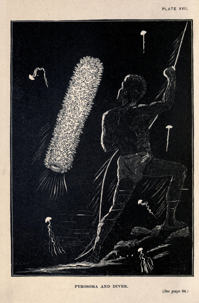 I have read by the light of a luminous beetle, and have determined the time of night while holding my watch in the glare of ocean animals. Von Bibra wrote his description of the Pyrosoma by its own light; the shark of Bennett illuminated his cabin like a chandelier; photographs have been taken by the light of luminous beetles and by phosphorescent plates; and probably the day is not distant when more important uses will be found for this wonderful light…