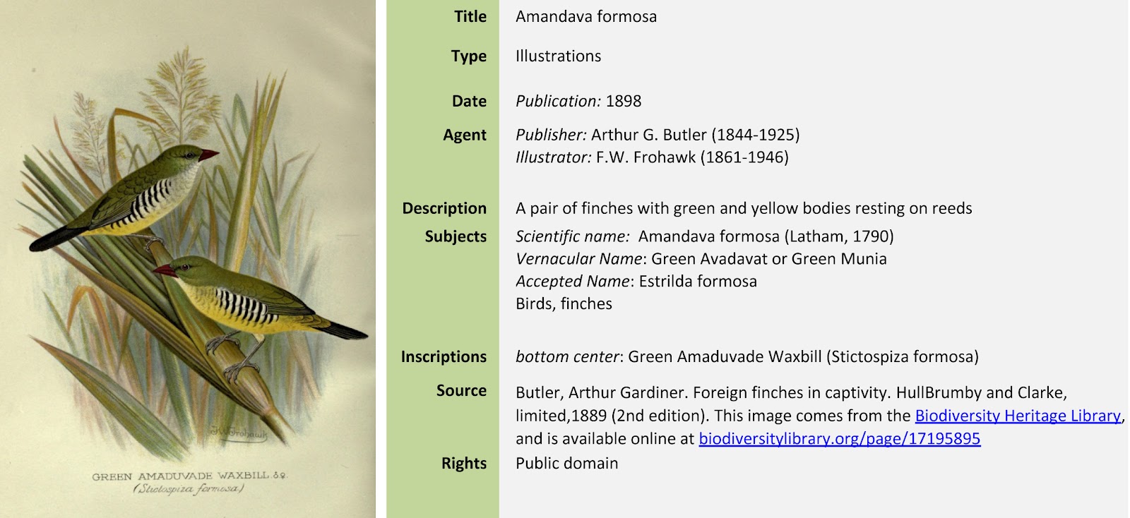The NEH-funded Art of Life project has set out to solve this problem both by developing an algorithm to automatically identify which pages contain illustrations and by creating a schema to further classify and guide the description of the illustrations so as to increase their accessibility to users. Once the algorithm tags pages containing illustrations, they will be pushed out to image-sharing platforms such as Flickr and Wikimedia Commons for crowdsourcing of the descriptions. The schema will provide guidance on the recording of fields and their values. (see an example of a BHL illustration marked up with the Art of Life schema below)