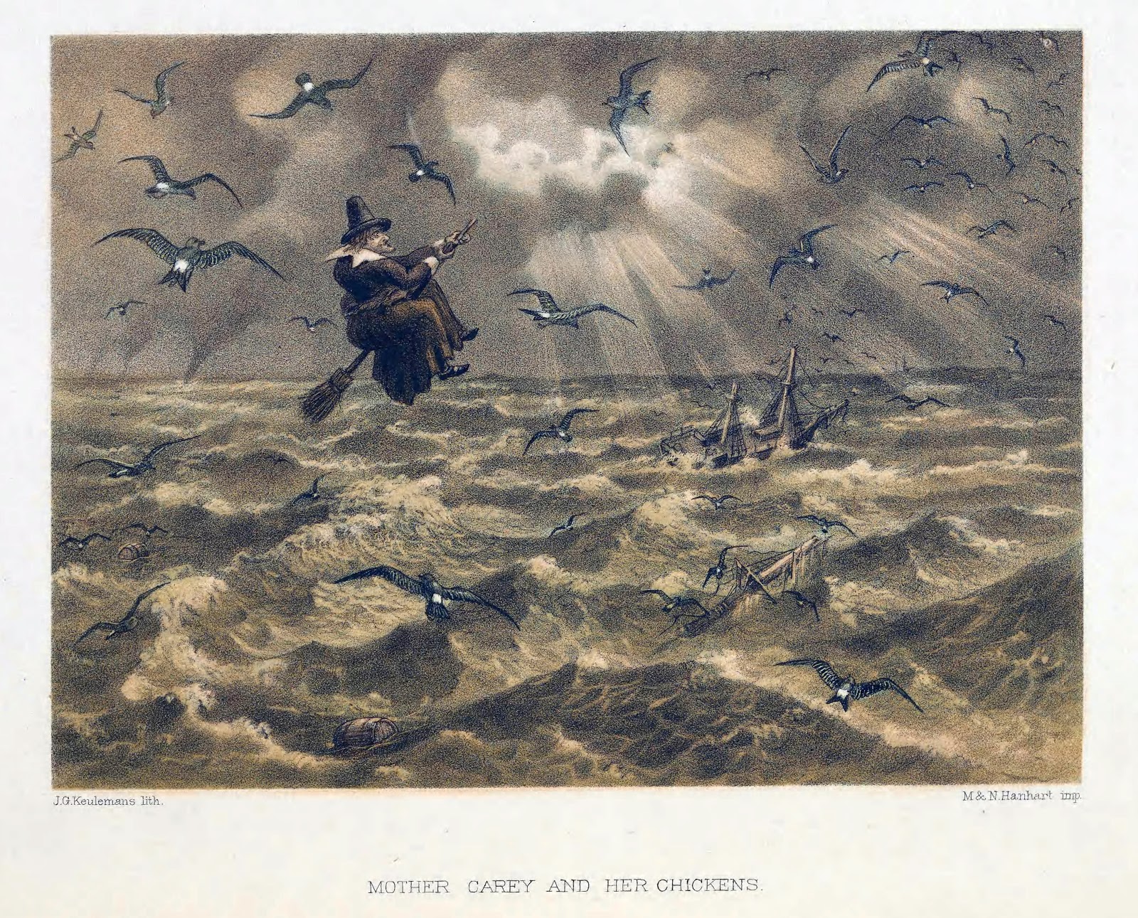 A supernatural figure apparently well-known to nineteenth century sailors, Mother Carey “personif[ied] the cruel and threatening sea,” orchestrating, along with Davy Jones (whom some purport as her husband) shipwrecks and claiming the lives of countless helpless victims. As the petrel species Thalassidroma bullockii and Thalassidroma pelagica are often seen before storms, sailors began branding them as Mother Carey’s minions, bestowing on them the somewhat confusing epithet Mother Carey’s Chickens.