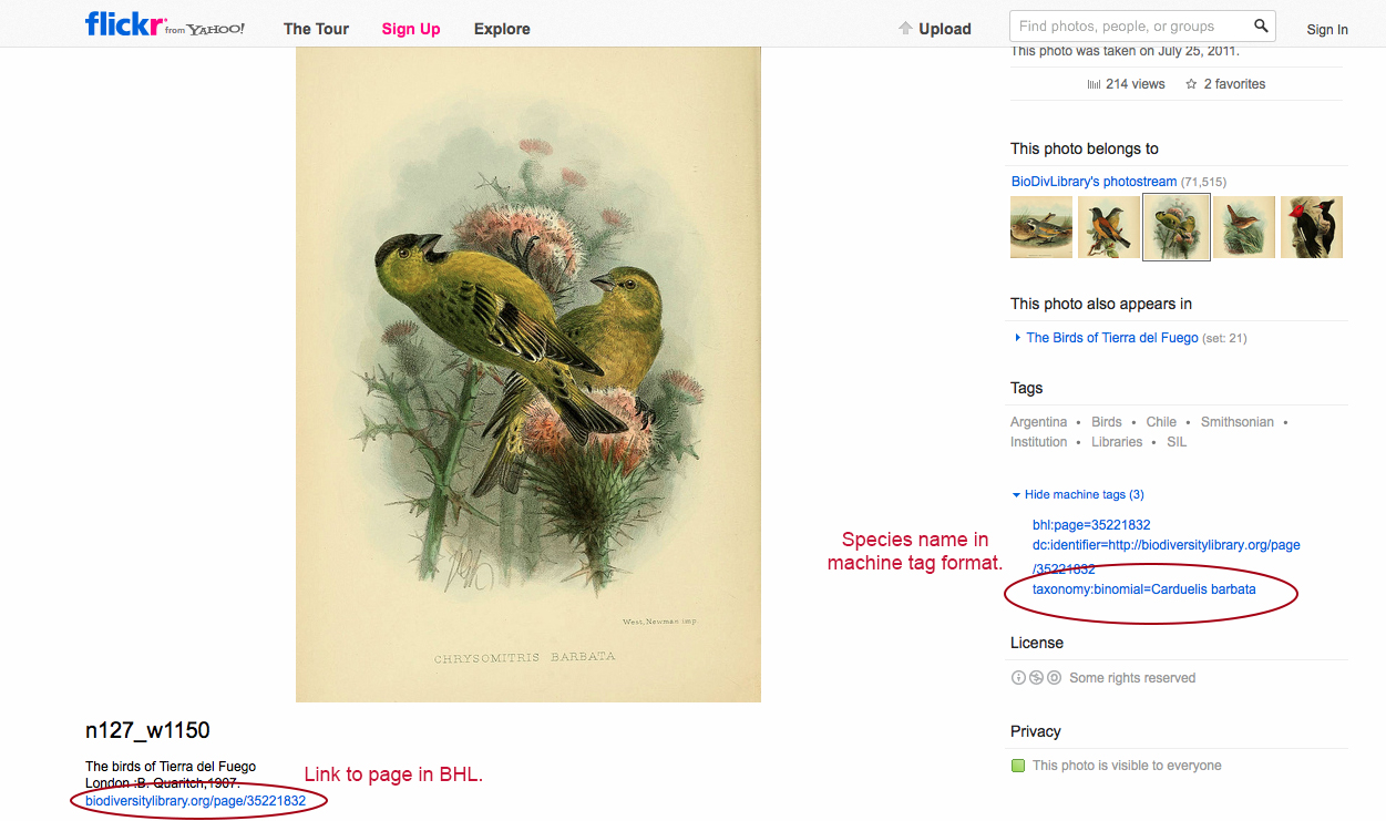 How can you identify the species if you don’t recognize it on sight? Many of our illustrations actually have the species name printed on the image itself. Simply transcribe that name into the machine tag format. If the name isn’t printed on the illustration, you may be able to find an identification in BHL. Click on the link below each image to view the book in BHL, then navigate through the text pages surrounding the image to see if the species identification is given. If so, input the name into the machine tag format in Flickr.