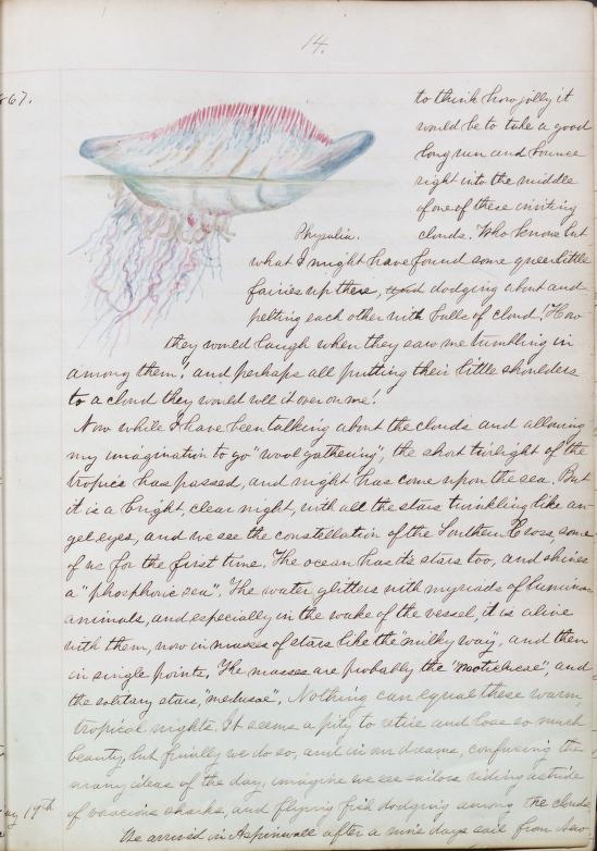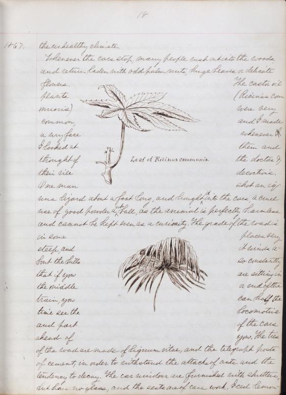 However, this tragic setback did not lessen Bailey’s enthusiasm for adventure and curiosity about the natural world. Bailey would eventually study under Dr. Asa Gray at Harvard University and at 24 years old, he became the botanist for the United States Geological Exploration of the 40th Parallel. The field book for this expedition chronicles Bailey’s journey through California and Nevada in a flowing prosaic style with beautiful illustrations and photographs of Bailey’s observations. The very first page of Bailey’s journal opens with a beautiful demonstration of his illustrative pen and ink style. Bailey’s rich descriptions are paired with exquisite drawings that seem to jump off the page whether he is waxing poetic about the Portuguese Man of War or closely observing the leaf of the Riccinus communis. Bailey’s flowing narrative style and gorgeous illustrations make this field book a charming and informative look at the exploration of the 40th parallel that will surely captivate readers.