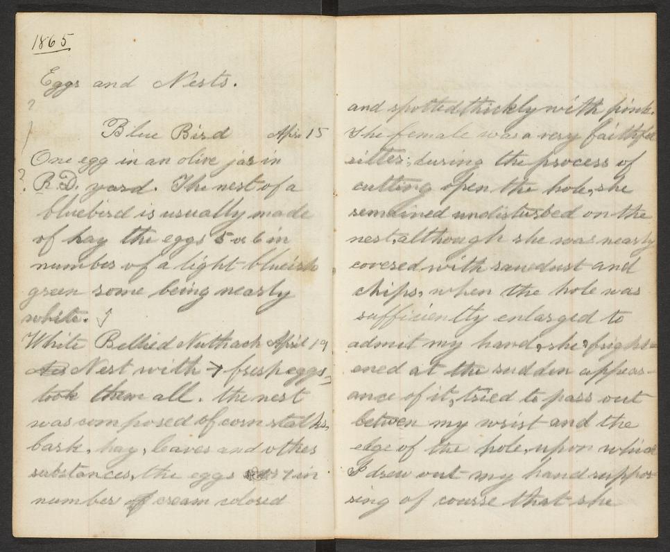 Renowned ornithologist William Brewster mused over his daily observations in a personal and often humorous way. William Brewster’s love of ornithology blossomed early, and he kept careful records of the birds he observed throughout his life. These journals begin when Brewster was 14 years old, and it is interesting to see how his hand, knowledge, and confidence all develop over time. In his later journals, Brewster takes care to write in a colloquial manner, and these notes provide unique insight into the daily life of a researcher over a 54 year span. This collection of journals also provide an enticing perspective on the detrimental changes to the environment and bird populations as a result of industrialization and the growth of urban centers.
