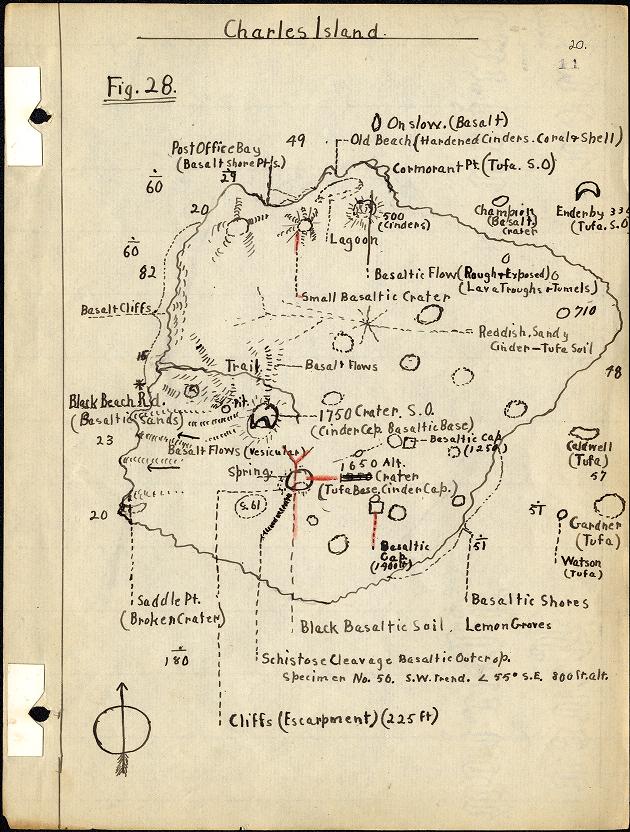 In 1905, the California Academy of Sciences sent 11 men off for a year and a day on an eighty-five foot schooner destined for the Galapagos Islands. While the expedition was underway, the California Academy of Sciences would fall into ruin during the great San Francisco earthquake of 1906. The specimens gathered during the Galapagos expedition would come to form the crux of the new California Academy of Sciences’ collections. Of the young men on that voyage, 26 year-old Washington Henry Ochsner travelled as the expedition’s geologist. His journals are more technical than Bailey’s in what they intended to capture and often included geological survey information, as well as inferences about how the geological features were formed. Ochsner also drew detailed surveys of the island terrains like this map of Charles Island. Ochsner’s field books have a scientifically focused structure and tend to be not-so-much a diary but a close and careful record of his scientific observations.
