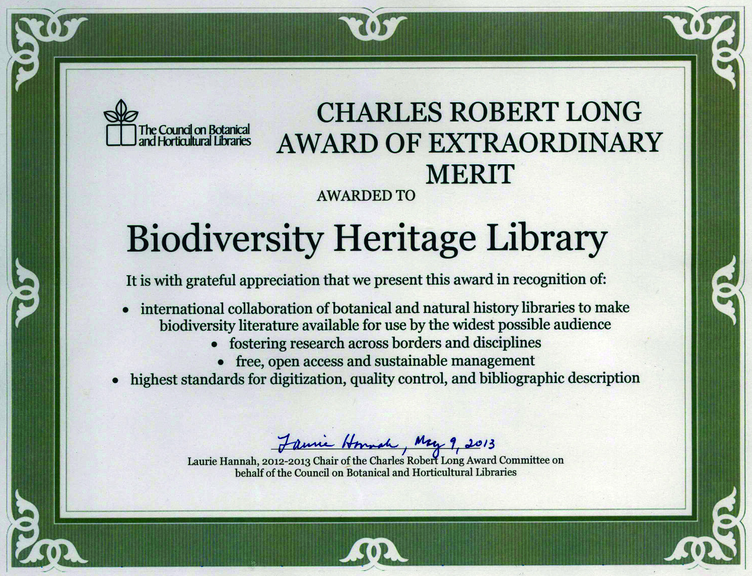 The Biodiversity Heritage Library is pleased to announce that it is the recipient of the Charles Robert Long Award of Extraordinary Merit from the Council on Botanical and Horticultural Libraries (CBHL).