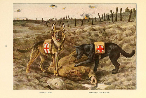 “The Red Cross dogs rendered invaluable service in feeding and aiding the wounded. Each one carried a first-aid kit either strapped to its collar or in a small saddle pouch. When they found a soldier who was unconscious, they were taught to bring back his helmet, handkerchief, or some other small article as a token of the discovery. Many of them learned wholly to ignore the dead, but to bark loudly whenever they came upon a wounded man.” [pg. 73]
