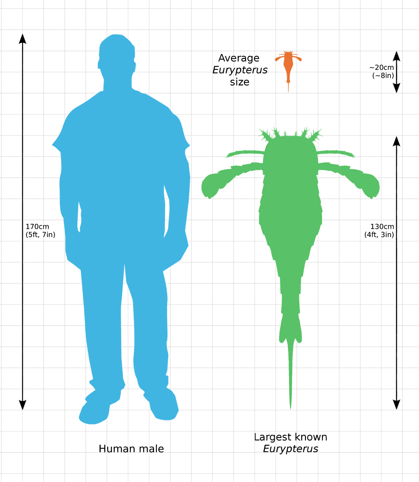 | This is a comparison of an average adult human male 5.6 ft with the average Eurypterus remipes length 7.9 inches and the largest known Eurypterus remipes fossil 4 feet 3 inches. Image from Wikipedia. |