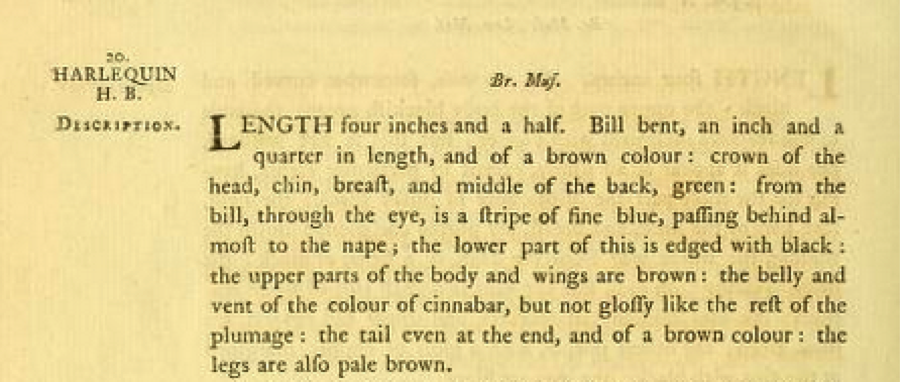 Unfortunately, Latham notes, that unique skin had “no history annexed to it,” and so he was unable to offer any information about the range or the habits of the species he named the Harlequin Humming-Bird.