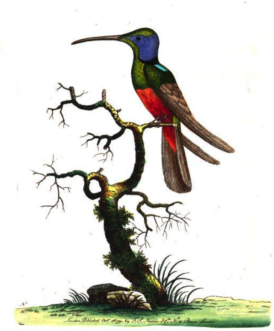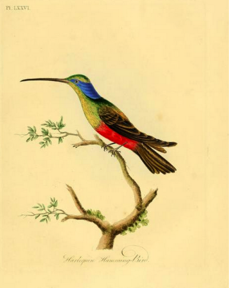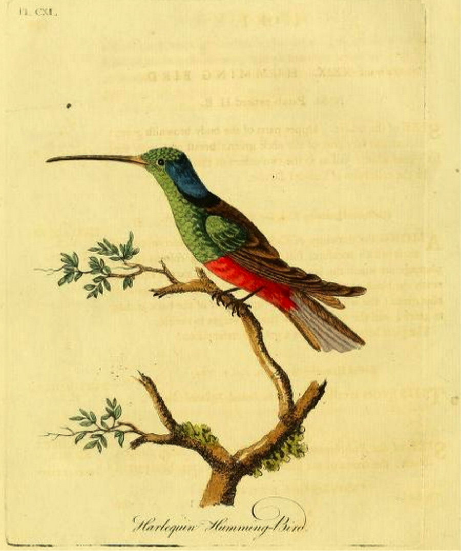 George Shaw, in his Naturalist’s Miscellany the following year, was able to narrow the range of the Harlequin, “among the rarest species of its genus,” to South America, hardly a bold conjecture in the case of a large, colorful hummingbird. Shaw’s account was accompanied by an awkwardly executed plate by Frederick Nodder, painted, Shaw claims, from the British Museum specimen; the telltale turquoise panel on the upper back, however, reveals that Nodder based his work on Davies’s—or, more likely, on Latham’s description of Davies’s sketch.