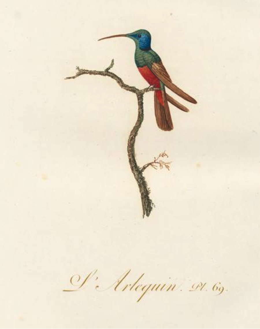 The Harlequin Hummingbird was painted again, by Sydenham Edwards, for Louis Pierre Vieillot’s 1802 continuation of the Oiseaux dorés, a lavish work begun by Vieillot and his collaborator Jean-Baptiste Audebert, who had died in December 1800. Vieillot claims that Edwards had worked directly from the skin in the British Museum; whether that was true or not, a close look suggests that Edwards was quite familiar with Nodder’s plate, too, from which it differs in omitting the nape patch Latham had noticed in the Davies drawing, a mark Vieillot says is indicative of a “variety” of the true Harlequin.
