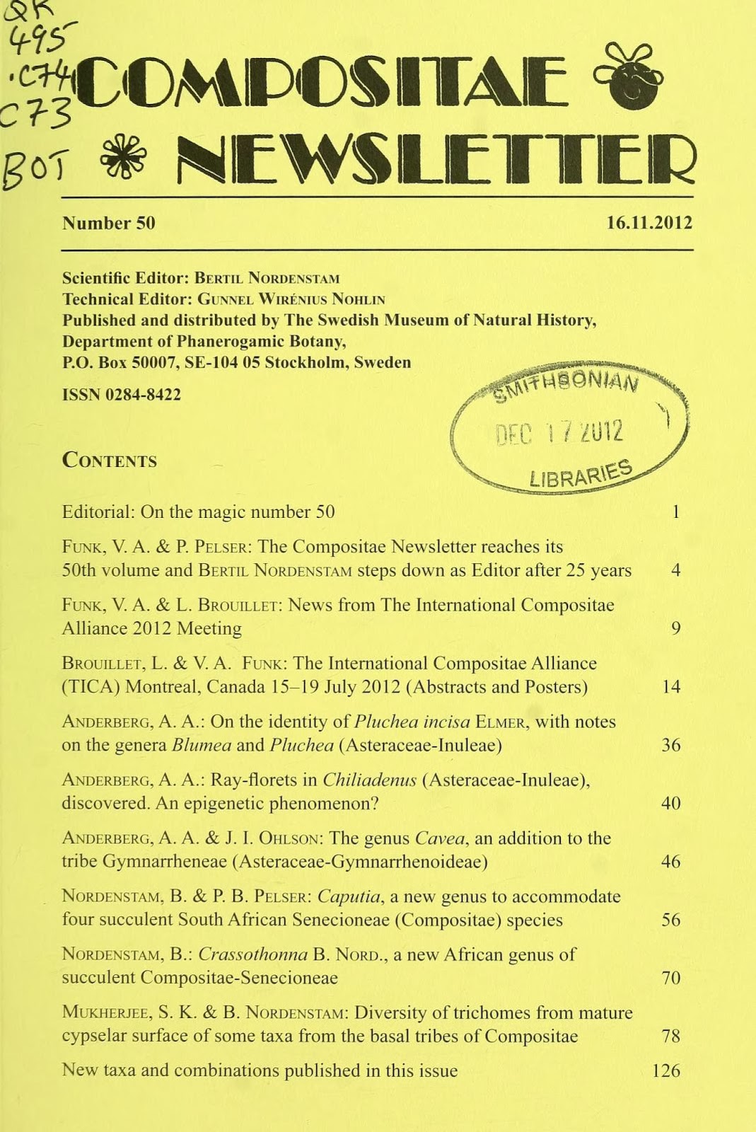 The publication began in 1975 and is useful to anyone with a taxonomic interest in the family Asteraceae, commonly known as the daisy or sunflower family. Asteraceae is a large plant family with 23,000 accepted species spread across 1,620 genera. Bertil Nordenstam, who recently retired as editor, is responsible for publishing the journal in its improved form, with announcements and lists of types, research articles and comprehensive works. A nice history of the publication can be found in Volume 50 of the publication. Currently, the print publication is held by 34 libraries worldwide, with a print distribution of approximately 600 copies. Providing it electronically through BHL allows for more researchers and libraries to learn about the publication and have access.