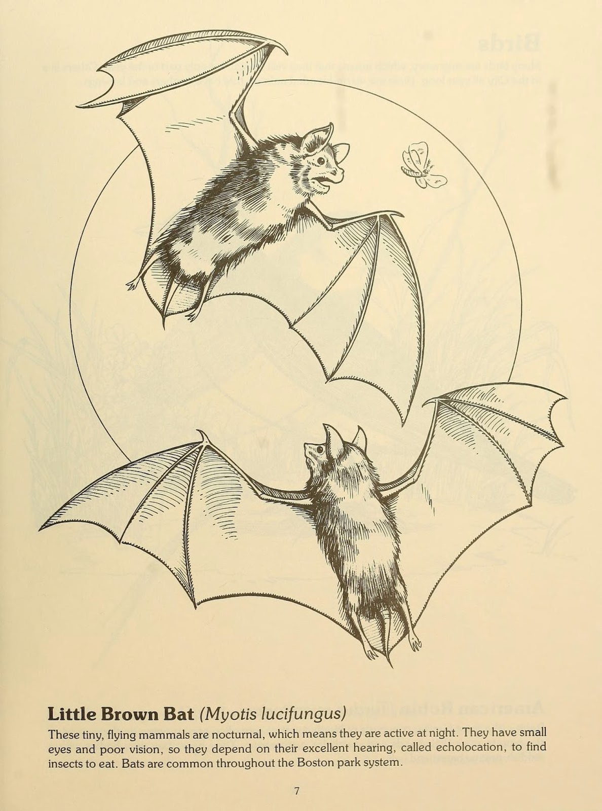 | A page from The Boston Park Rangers Nature Book highlighting Myotis lucifungus, or little brown bat. http://biodiversitylibrary.org/page/38658209 |