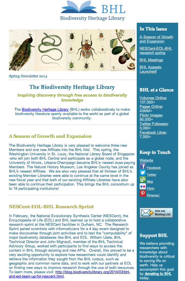 The last several months have been an intense and exciting period of growth and expansion for BHL. Not only has the steady growth of collections continued but BHL as an organization has been growing as well. In the first two quarters of fiscal year 2014, three new Members and one new Affiliate joined BHL-Central. BHL’s global presence is expanding as well with one of those new Members also participating as a global node.