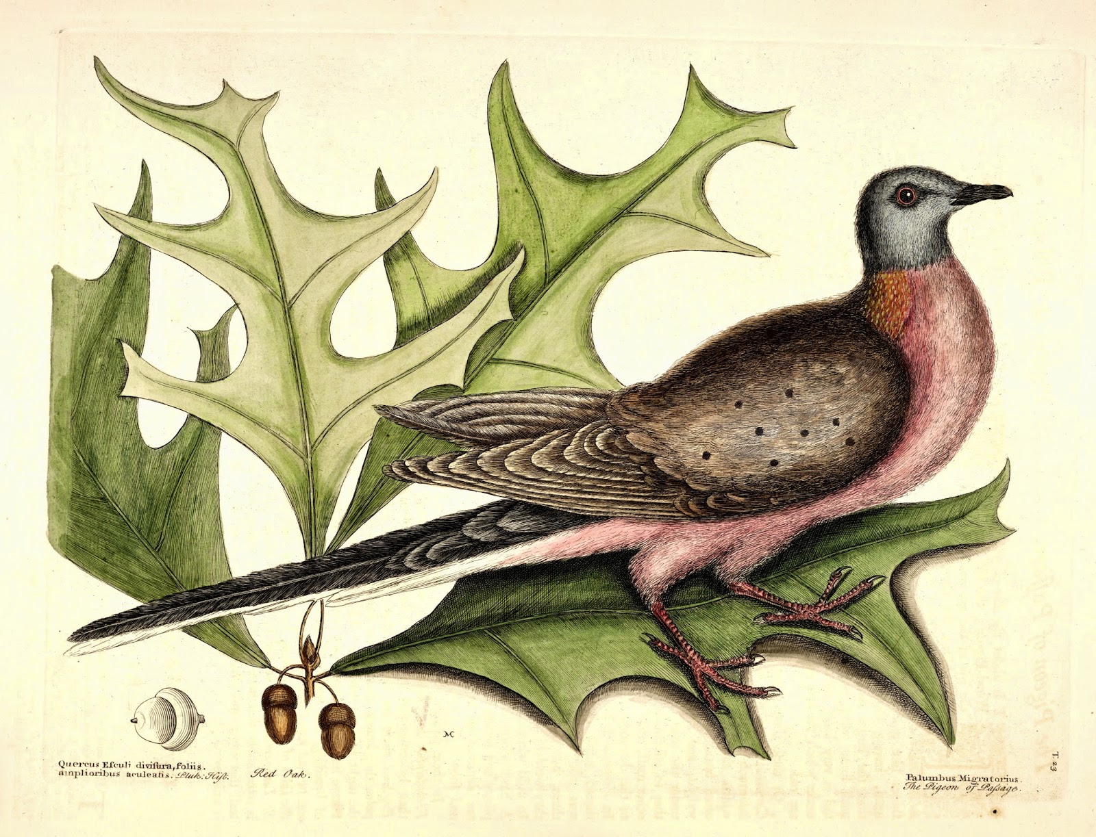 | Mark Catesby’s 1754 illustration of the Passenger Pigeon is thought to be the first published depiction of the species. The Natural History of Carolina, Florida, and the Bahama Islands. v. 1. 1754. http://biodiversitylibrary.org/page/10900155 |