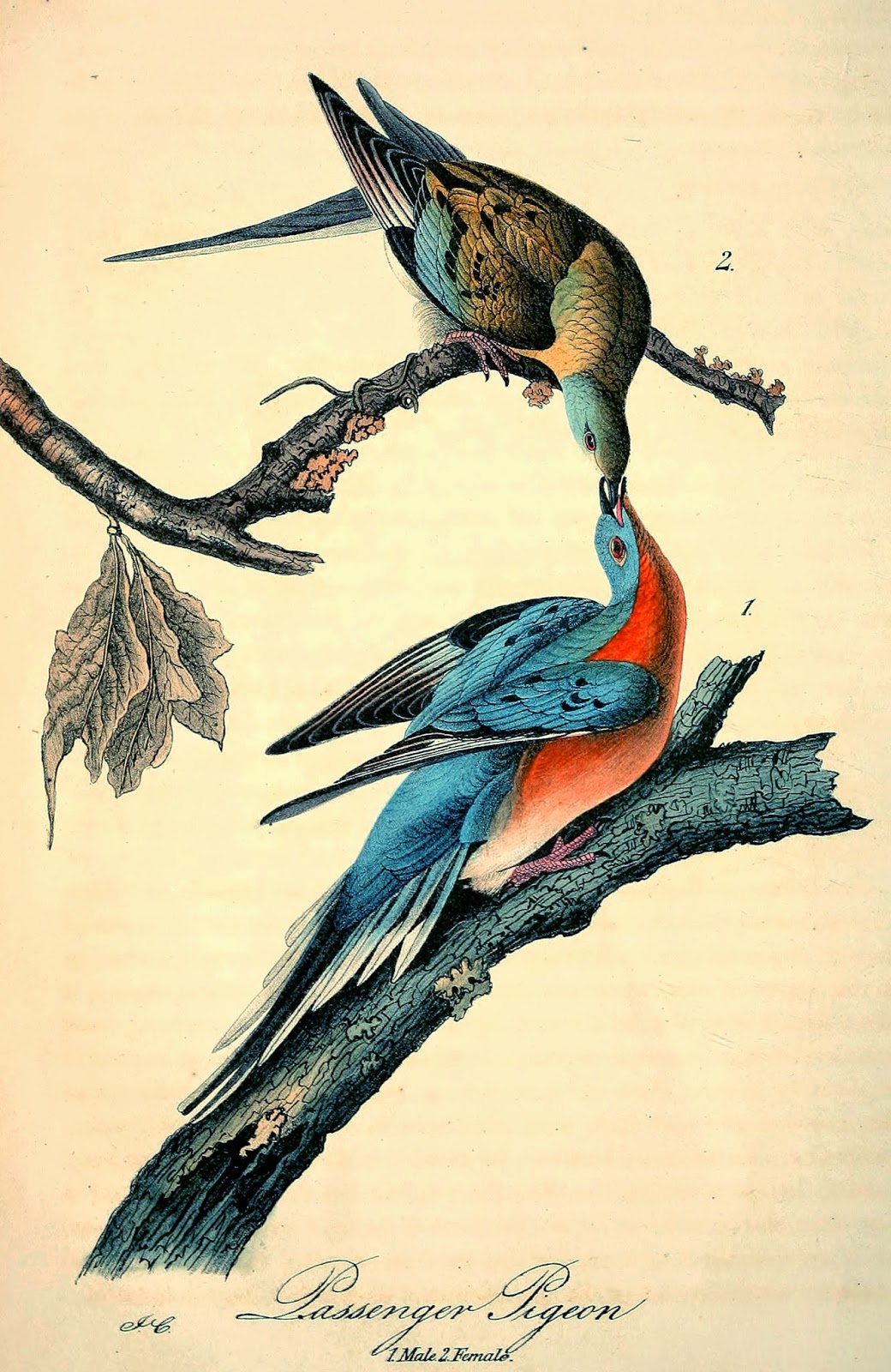 | Male (lower) and female (upper) Passenger Pigeons. As with most bird species, the male is more brightly-colored than the female. The Birds of America. v. 5. 1842. http://biodiversitylibrary.org/page/40419582 |