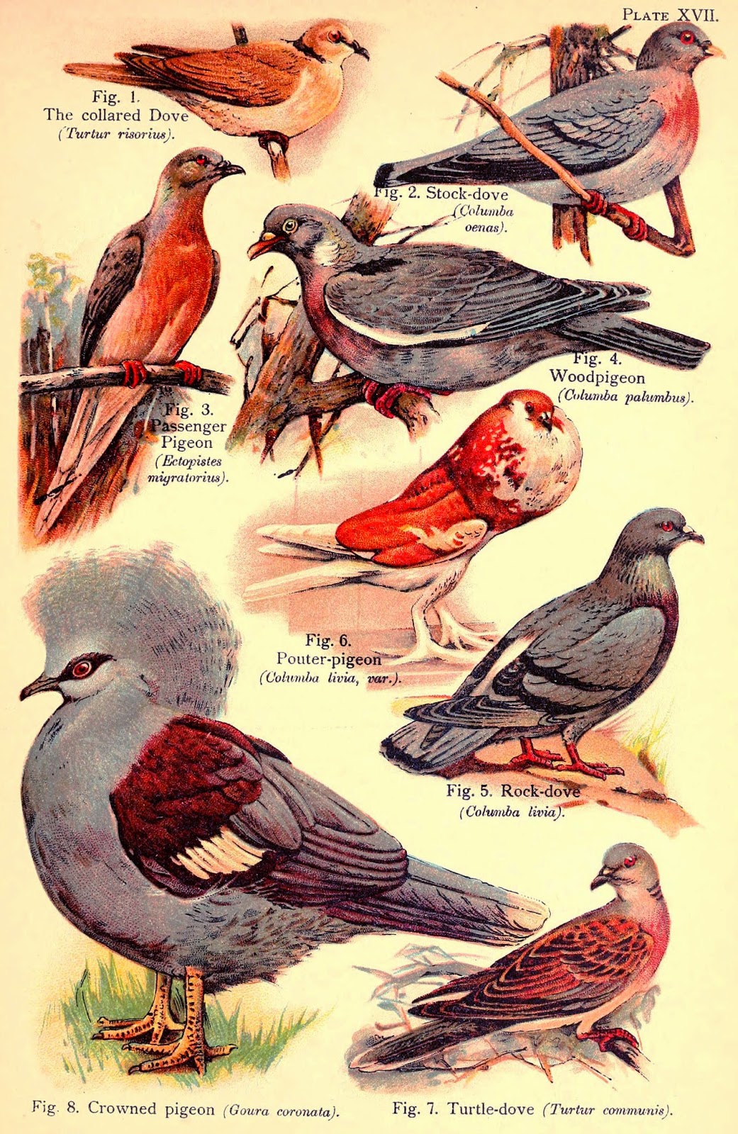 | The Passenger Pigeon amongst some of her relatives. Pigeons and Doves together constitute the bird clave Columbidae, containing about 310 species. A Book of Birds. 1908. http://biodiversitylibrary.org/page/13504819 |