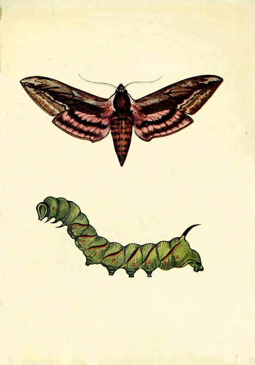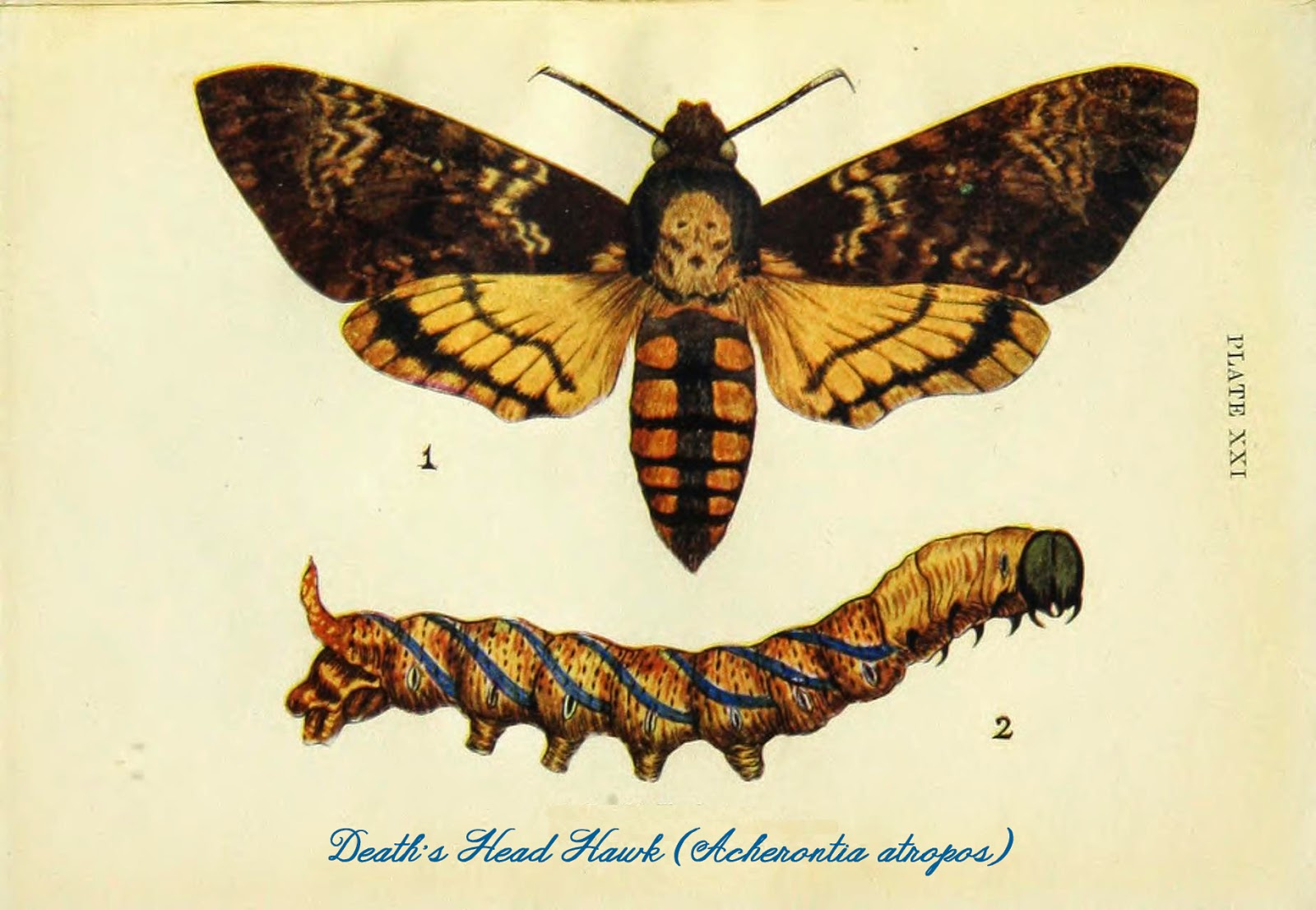 “And if you meet with [the Death’s Head Hawk], and pick it up, you will be surprised to find that it can squeak quite loudly! Stranger still, the chrysalis can squeak too, and so can the moth ! Indeed, if you pick up a Death’s Head Hawk Moth it will go on squeaking very much like a mouse all the time that you hold it in your hand!” (pg 39)