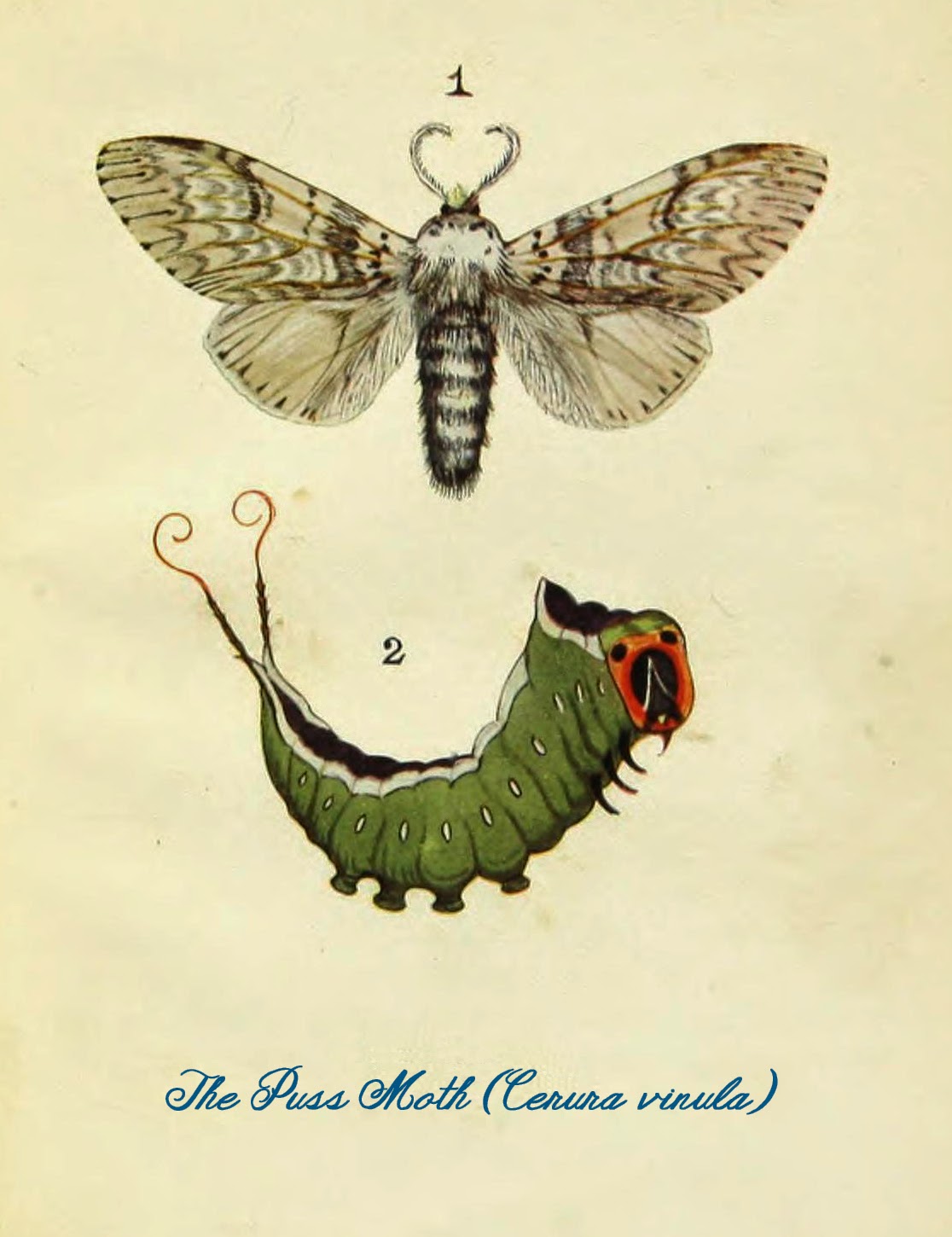 “This fine and handsome moth is called the ‘Puss,’ because, when its wings are closed, it looks rather like a brindled cat. And there are two or three smaller moths which are a good deal like it; so these are known as ‘Kittens.'” (pg 79).