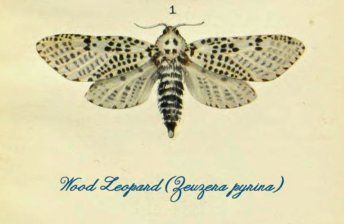 “You may sometimes see [the Wood Leopard] resting on the trunks of trees in July and August. Then, if you examine the tree-trunk carefully, you are almost sure to find the entrance to the burrow out of which it came; for the caterpillar of this moth is one of those which feed on the solid wood of trees. The female moth lays her eggs in the crevices of the bark, and as soon as the little caterpillars appear they nibble their way into the trunk with their powerful jaws, and there live for several months, burrowing backwards and forwards, day after day, till sometimes the wood is almost honeycombed with their tunnels.” (pg 50)