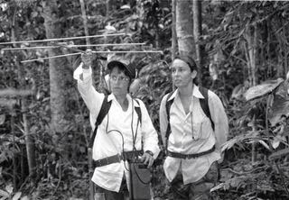 | Devra Kleiman and colleague conducting playback study. From the Field Book Project. |