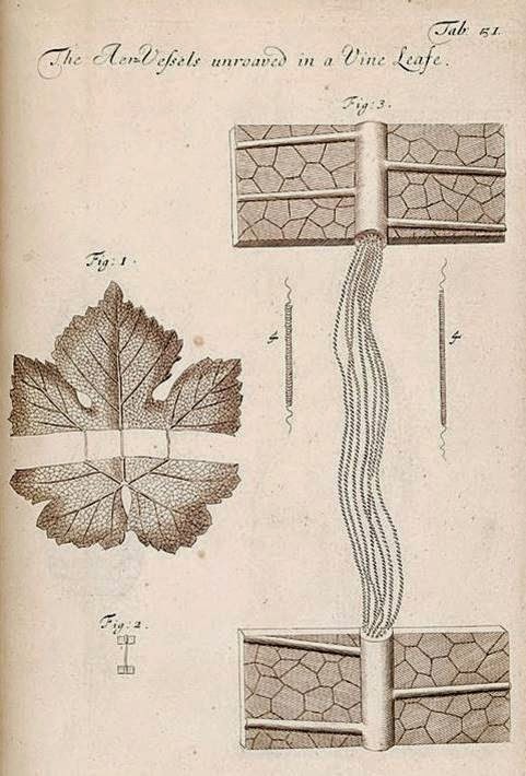 | Drawings of a grapevine stem and leaf showing the transport vessels, from Nehemiah Grew’s The Anatomy of Plants (1682). |
