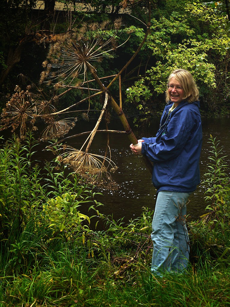 | Mary Williams demonstrating the size of giant hogweed (Heracleum mantegazzianum). |