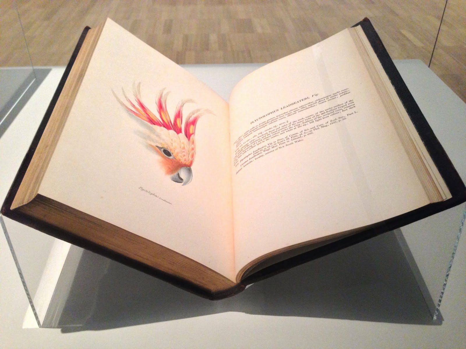 | Major Mitchell’s Cockatoo, illustrated by Elizabeth Gould for John Gould’s A synopsis of the birds of Australia, and the adjacent islands, 1st edition, London, 1837-38, on display at Melbourne Museum. The entire book can now be viewed online. Image: Nicole Kearney Source: Museum Victoria |