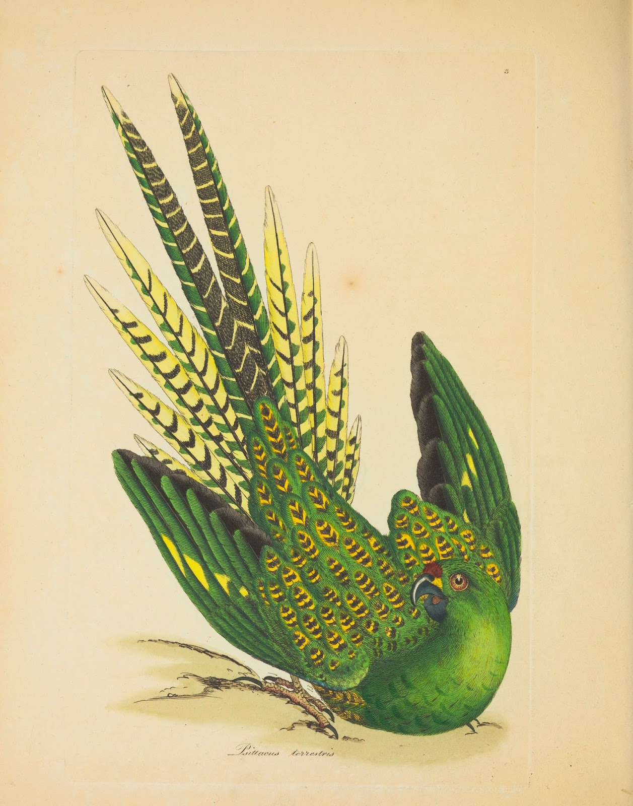 | Ground Parrot, illustrated by James Sowerby, for George Shaw’s Zoology of New Holland, volume 1, 1st edition, London, 1794. The entire book can now be viewed online. Source: Biodiversity Heritage Library |