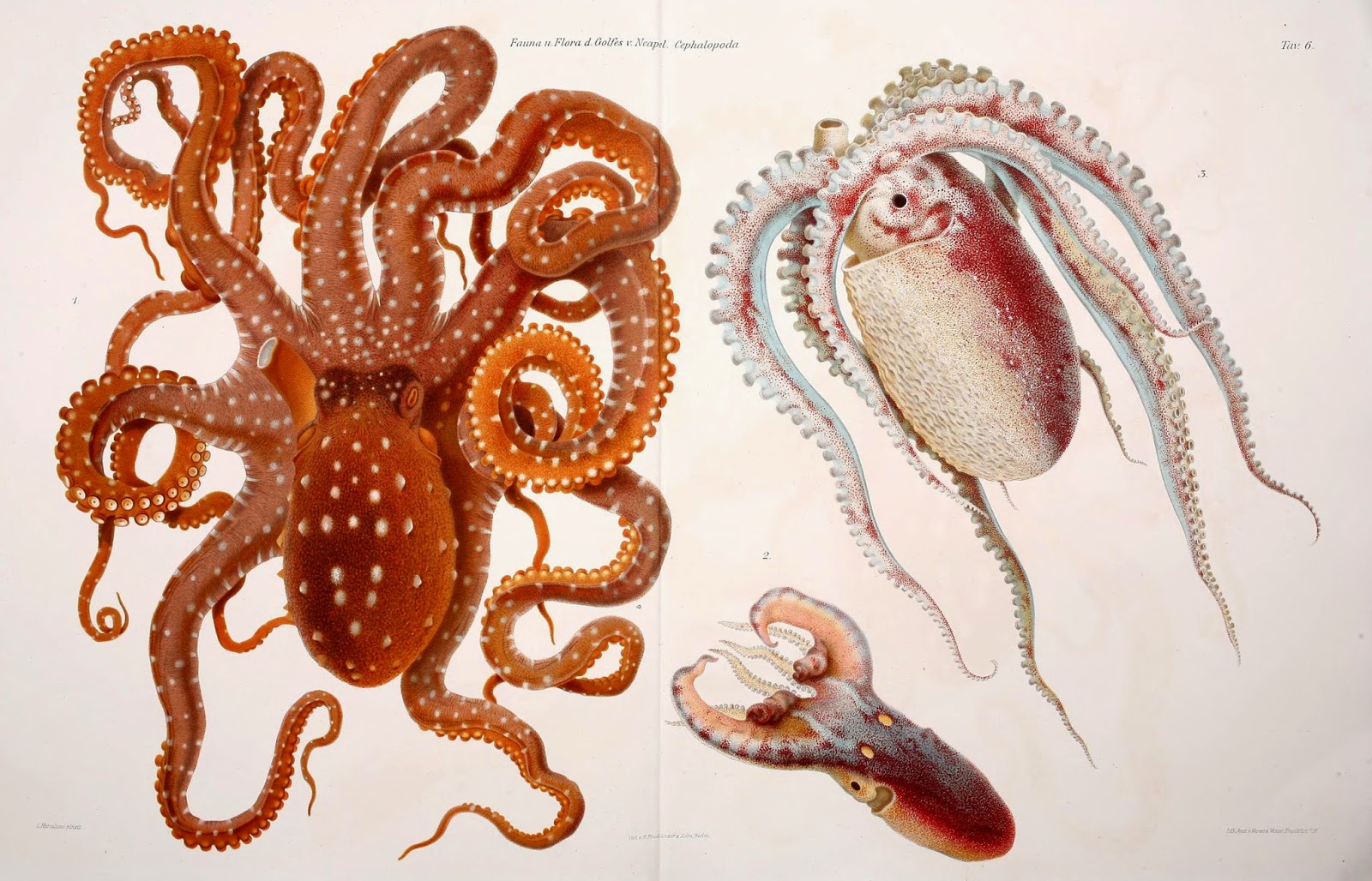 | Amazing Mollusca from the Gulf of Naples: Octopus macropus, Tremoctopus violaceus, and Ocythoe tuberculata. Jatta, Giuseppe. I Cefalopodi viventi nel Golfo di Napoli (sistematica) : monografia. 1896. http://biodiversitylibrary.org/page/35424286. |
