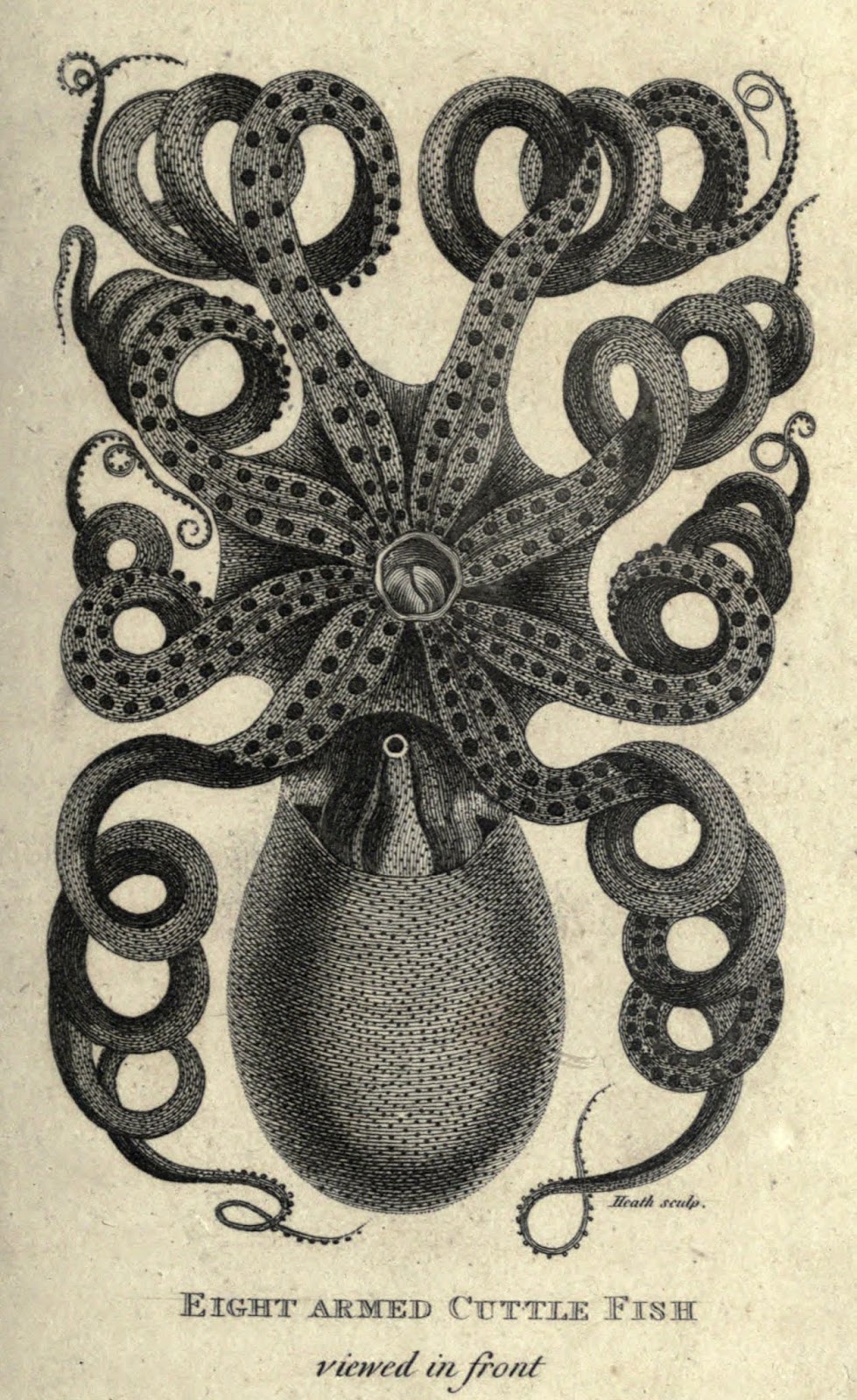 | “Eight Armed Cuttle Fish” aka Curled Octopus. Shaw, George. Zoological Lectures Delivered at the Royal Institution by George Shaw. v. 2. 1809. http://biodiversitylibrary.org/page/21511926. |