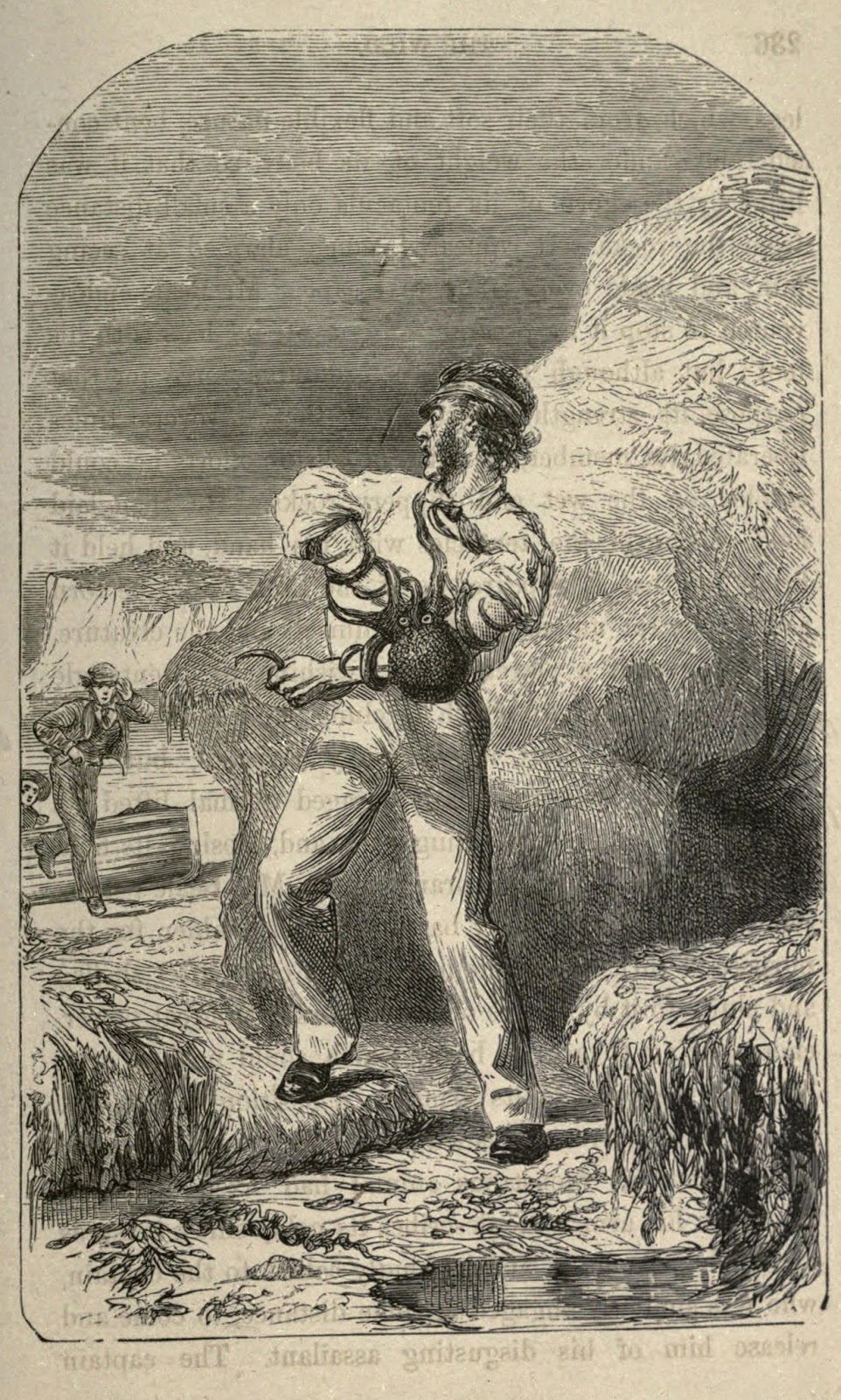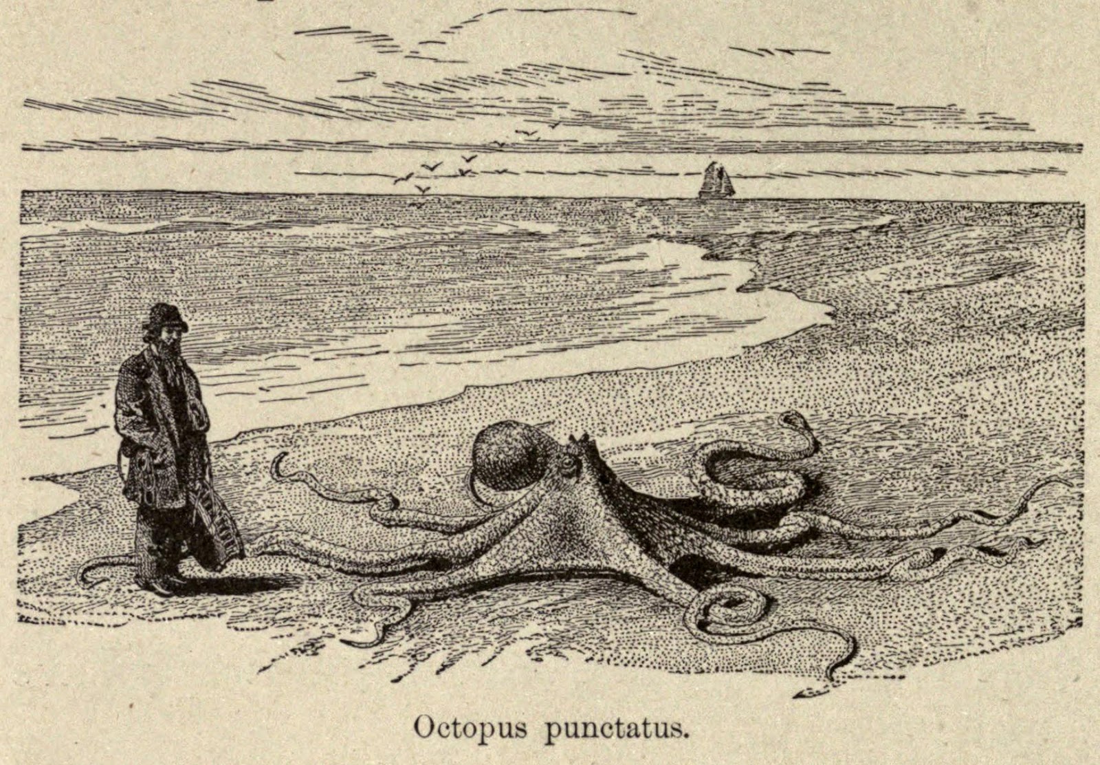 | Thomas Beale, surgeon on a British whaling voyage in 1835, claimed he was attacked by an octopus on the beach on the Bonin Islands, south of Japan. Gosse, Philip Henry. The Romance of Natural History. 1864. http://biodiversitylibrary.org/page/23537396. |