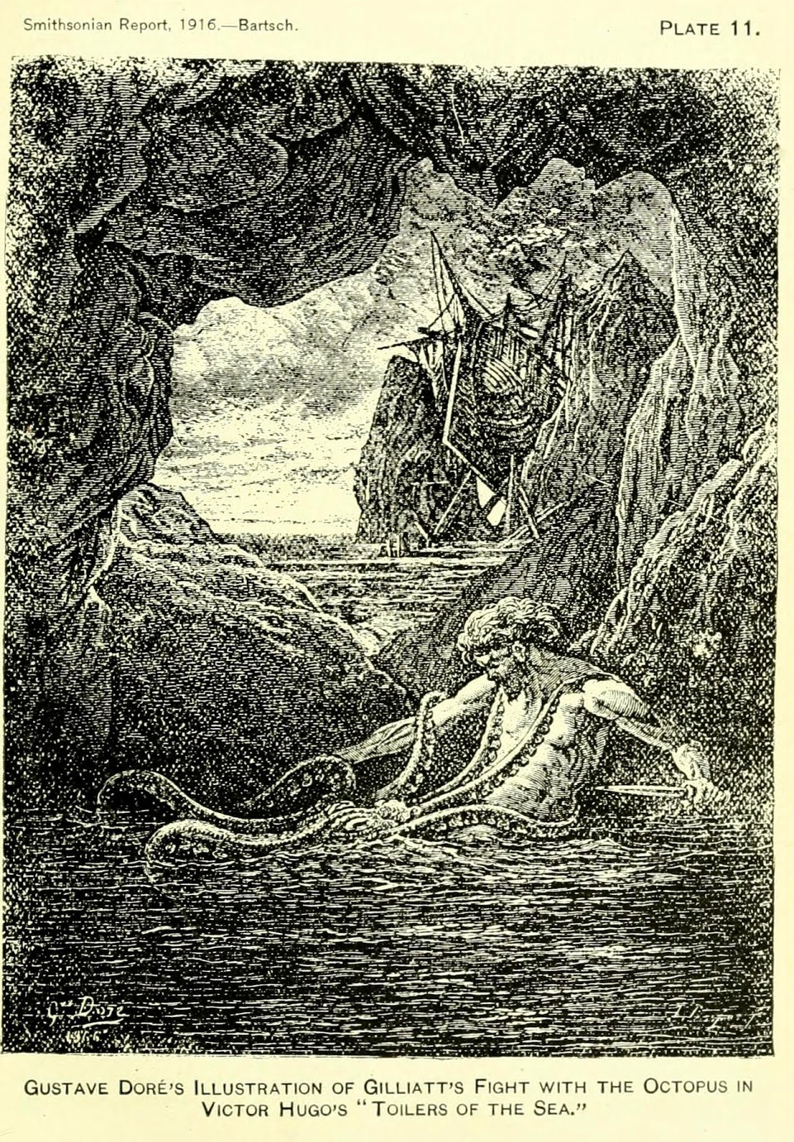 | Gillat’s struggle with the “monster” octopus, as described in Toilers of the Sea. Annual Report of the Board of Regents of the Smithsonian Institution. 1916. http://biodiversitylibrary.org/page/14187072. |