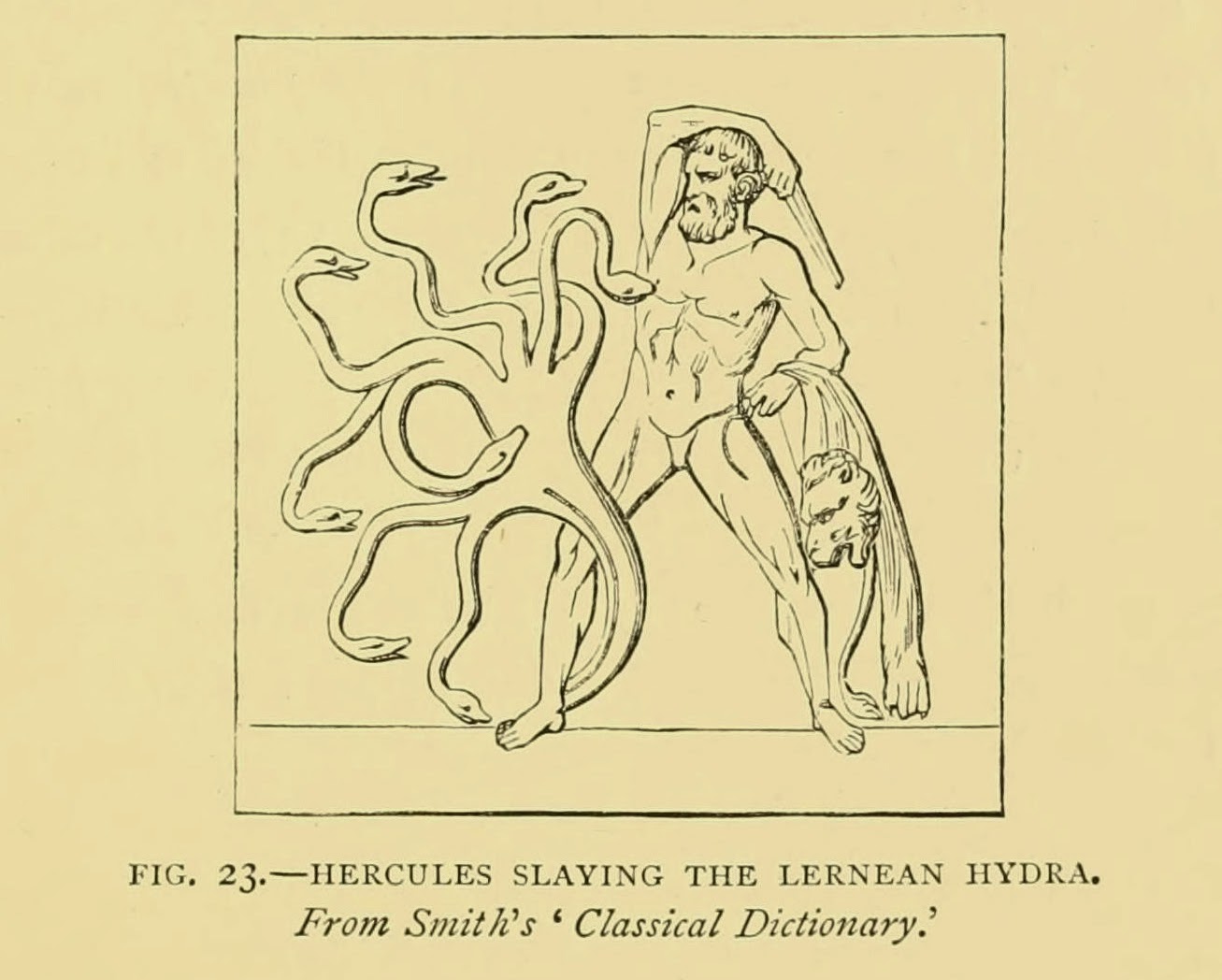 | Hercules slaying the Lernean Hydra, as depicted on a marble tablet in the Vatican. Lee, Henry. Sea Fables Explained. 1883. http://biodiversitylibrary.org/page/10985663. |