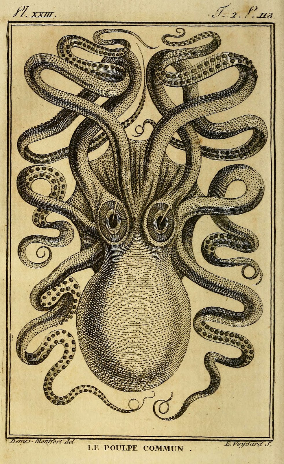 | “The Common Octopus.” Montfort, Denys. Histoire naturelle, générale et particulière des mollusques : animaux sans vertèbres et a sang blanc. v. 2. 1801. http://biodiversitylibrary.org/page/35755415. |