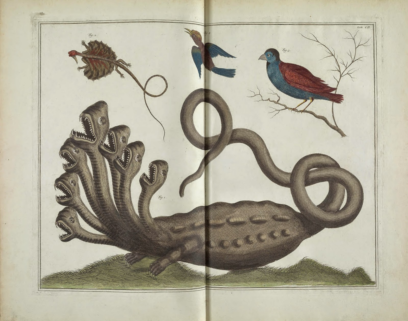 Well into the eighteenth century, many naturalists believed the hydra to be a real creature. Albertus Seba, a famed apothecary from Amsterdam, boasted an extensive cabinet of curiosities, filled with many magnificent biodiversity specimens. From 1734-65, Seba published an account of his cabinet in Locupletissimi rerum naturalium thesauri accurata descriptio, et iconibus artificiosissimis expressio, per universam physices historiam. This work included an image of a hydra, based on a specimen held by the Burgomeister of Hamburg. While Linnaeus later proved this particular specimen to be a fake, an amalgamation of snake skins and weasel heads with possible religious overtones, exaggerated accounts of an octopus likely inspired such monsters in the first place.