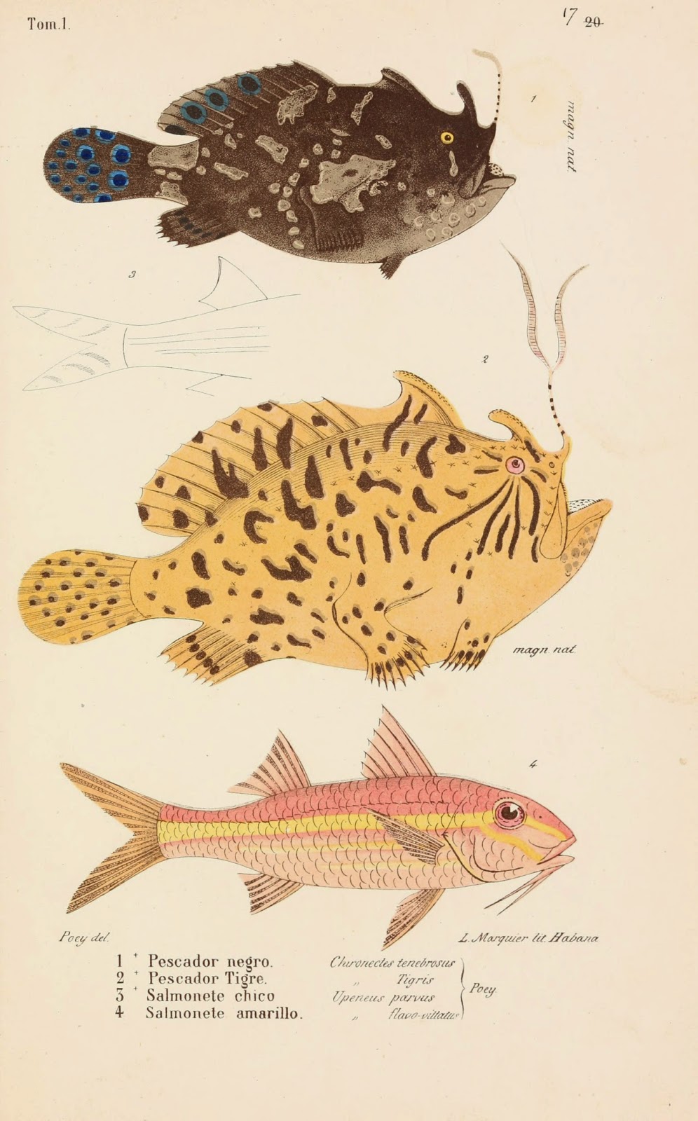 | Illustration from Felipe Poey’s Memorias sobre la historia natural de la isla de Cuba, acompañadas de sumarios latinos y extractos en frances (1851-58). http://biodiversitylibrary.org/page/2525313. |